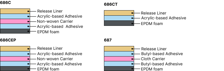 | 687C | Butyl adhesive, cloth carrier | Greasy, rough and rubber base substrates |
