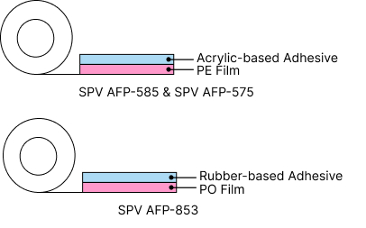 These products consist of a PE film coated with a pressure sensitive acrylic-based adhesive (AFP-585 and AFP-575) or PO film coated with a pressure sensitive rubber-based adhesive (AFP-853).