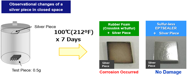 Se trata de un material sellador flexible elaborado con caucho EPDM en una estructura con células semicerradas. Es una espuma limpia que no contiene azufre que se utiliza habitualmente en la vulcanización del caucho y que podría corroer metales. Se puede utilizar para aplicaciones de absorción de impactos, insonorización y a prueba de polvo alrededor de dispositivos electrónicos herméticos sin corroer el metal.