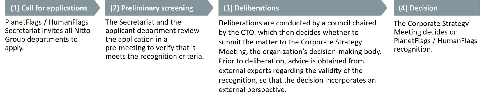 The PlanetFlags/HumanFlags recognition scheme supports Nitto Group’s efforts to address material issues for sustainability (materiality). Products are assessed using Nitto’s own criteria from two perspectives – environmental impact and societal impact – and those with outstanding contributions are recognized as PlanetFlags or HumanFlags.