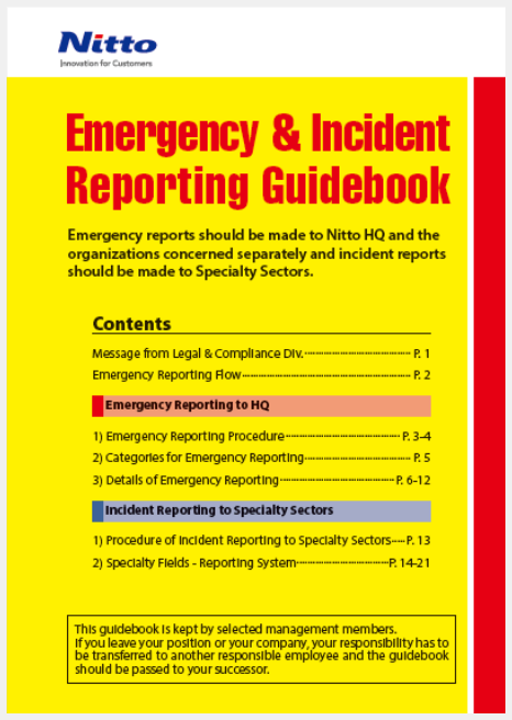 Em caso de ocorrência de um desastre de grandes proporções ou um acidente sério, um sistema desenvolvido pelo Nitto Group aciona imediatamente a alta gerência. Os funcionários são informados sobre isso no Guia de relato de emergência e incidentes. Quando o presidente da Nitto decidir que isso é necessário, a sede de emergência será estabelecida imediatamente. Embora as informações sobre o estado dos danos e o impacto do evento sejam coletadas e analisadas, todas as empresas e bases do grupo afetadas receberão apoio do Nitto Group.