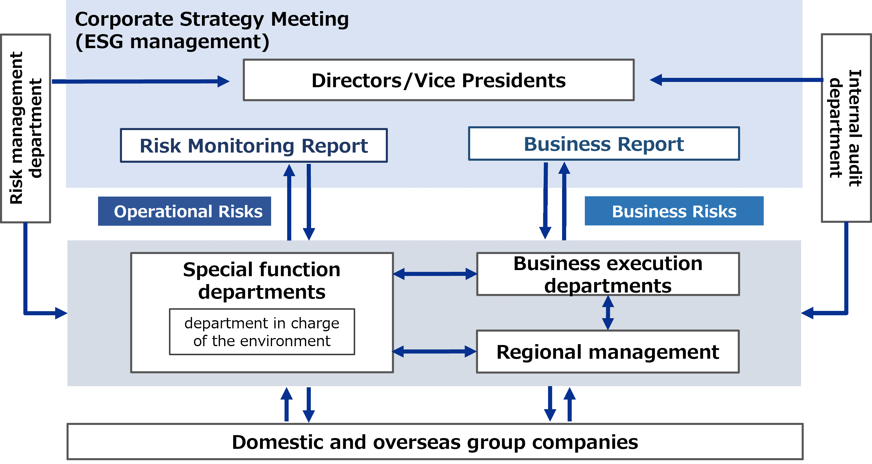 The key risks and opportunities related to the environment issues including climate change will be monitored by business execution departments and regional managers in collaboration, while the department responsible for environmental issues will assume responsibility for managing them. Information regarding monitored risks and opportunities, together with information managed by other special function departments, will be reported and deliberated monthly at the Corporate Strategy Meeting, which consists of Directors and Vice Presidents. The results of the deliberation will be instantly communicated to related departments, and countermeasures against risks and measures for opportunities will be promptly taken to strengthen controls. The progress of the implementation and improvement will be again reported to and monitored at the Corporate Strategy Meeting to increase the effectiveness of the Group management.