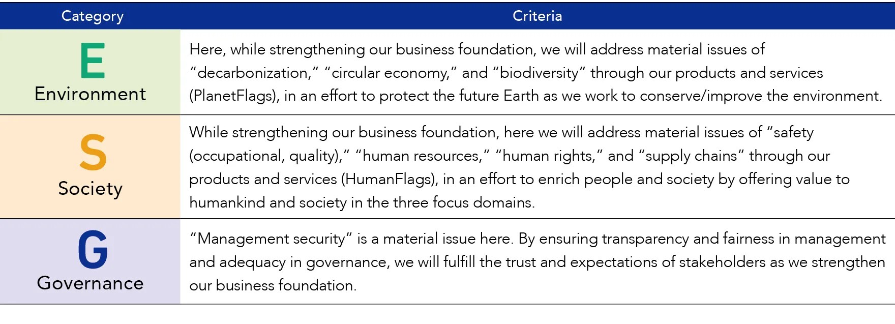 These material issues have been selected and identified as such from issues deemed important as they might affect the company and its stakeholders (the environment and society) over the long term. In implementing them, we identify risks and opportunities associated with each issue and reflect them in our business plans.