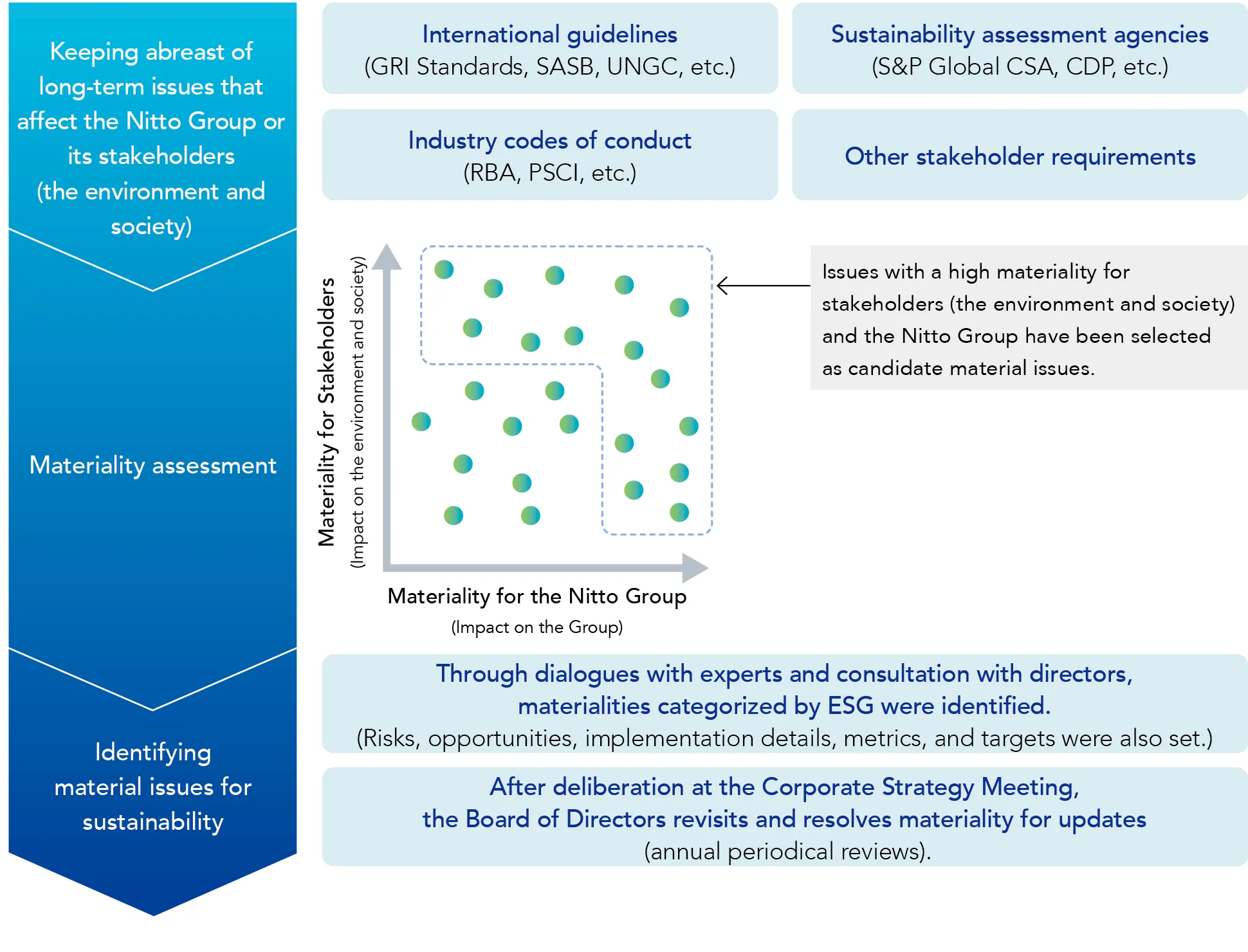 In 2019, the Nitto Group identified its material issues for sustainability (materiality) in a bid to simultaneously solving social issues and creating economic value. Amid the changing external environment with sustainability and ESG (Environment, Society, and Governance) assuming growing importance worldwide, the Nitto Group announced that it would place ESG at the core of its management. Accordingly, the Group revisited its material issues for sustainability in order to become an “essential” entity for the global environment, humankind, and society, as well as the general public, further driving sustainable growth.