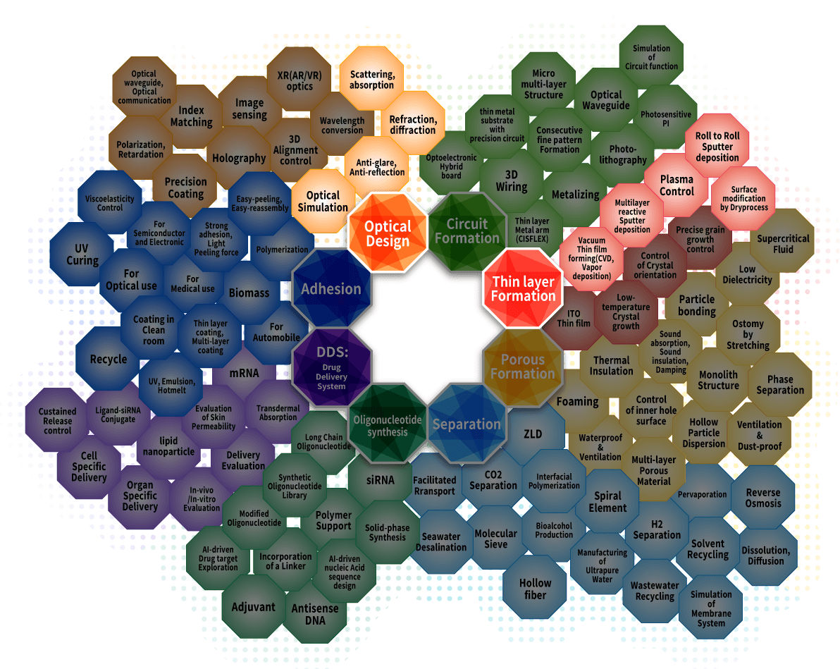 At Nitto Group, based on 8 core technologies, dozens of peripheral technologies have been researched and developed. These technologies have been combined to create a “composite of technologies”,