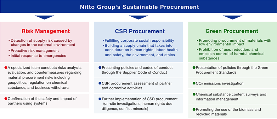 The Nitto Group is committed to sustainable procurement activities through initiatives such as "Risk Management," "CSR Procurement," and "Green Procurement." These activities are aligned with the Nitto Group's policy of placing ESG at the core of its management and are implemented through the Supplier ESG Program. The goal of these procurement activities is to identify and mitigate risks associated with supply chain disruptions, human rights violations, and environmental issues such as CO2 emissions reduction, in response to changes in market conditions.