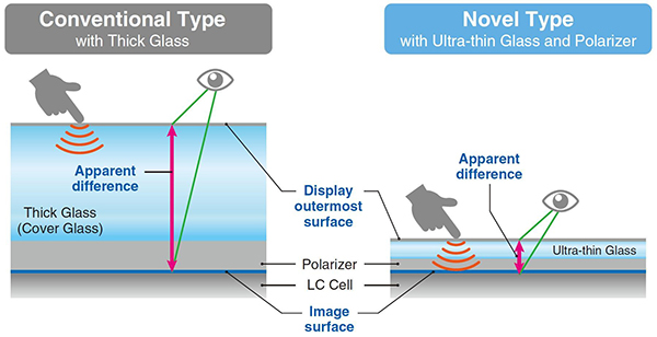 Le due aziende si sono impegnate nello sviluppo di nuovi materiali dalle funzioni innovative attraverso la combinazione del vetro ultra sottile G-Leaf™ di NEG e della vasta gamma di pellicole polimeriche ad alte prestazioni di Nitto. Il prodotto integrato è stato sviluppato mediante la laminazione di 100 μm di vetro ultrasottile G-Leaf™ e la sottile pellicola polarizzante Nitto attraverso un processo roll-to-roll; si tratta della prima combinazione di questo tipo al mondo. È estremamente sottile e leggero. L’utilizzo come copertura di un pannello contribuirà notevolmente a migliorare la visibilità riducendo la differenza apparente tra la superficie di visualizzazione e la superficie dell’immagine e migliorando la sensibilità dei sensori tattili. Inoltre, il prodotto conserva la consistenza, la planarità e la durezza tipiche del vetro.