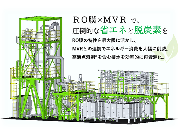 本装置は、Nittoが製造※2する高性能RO膜の特性を最大限に活用し、木村化工機のエンジニアリング技術と融合することで開発されたものです。RO膜による高効率濃縮とMVR(自己蒸気機械圧縮)を組み合わせることで、従来の蒸留方式に比べ圧倒的な省エネ性を実現しました。