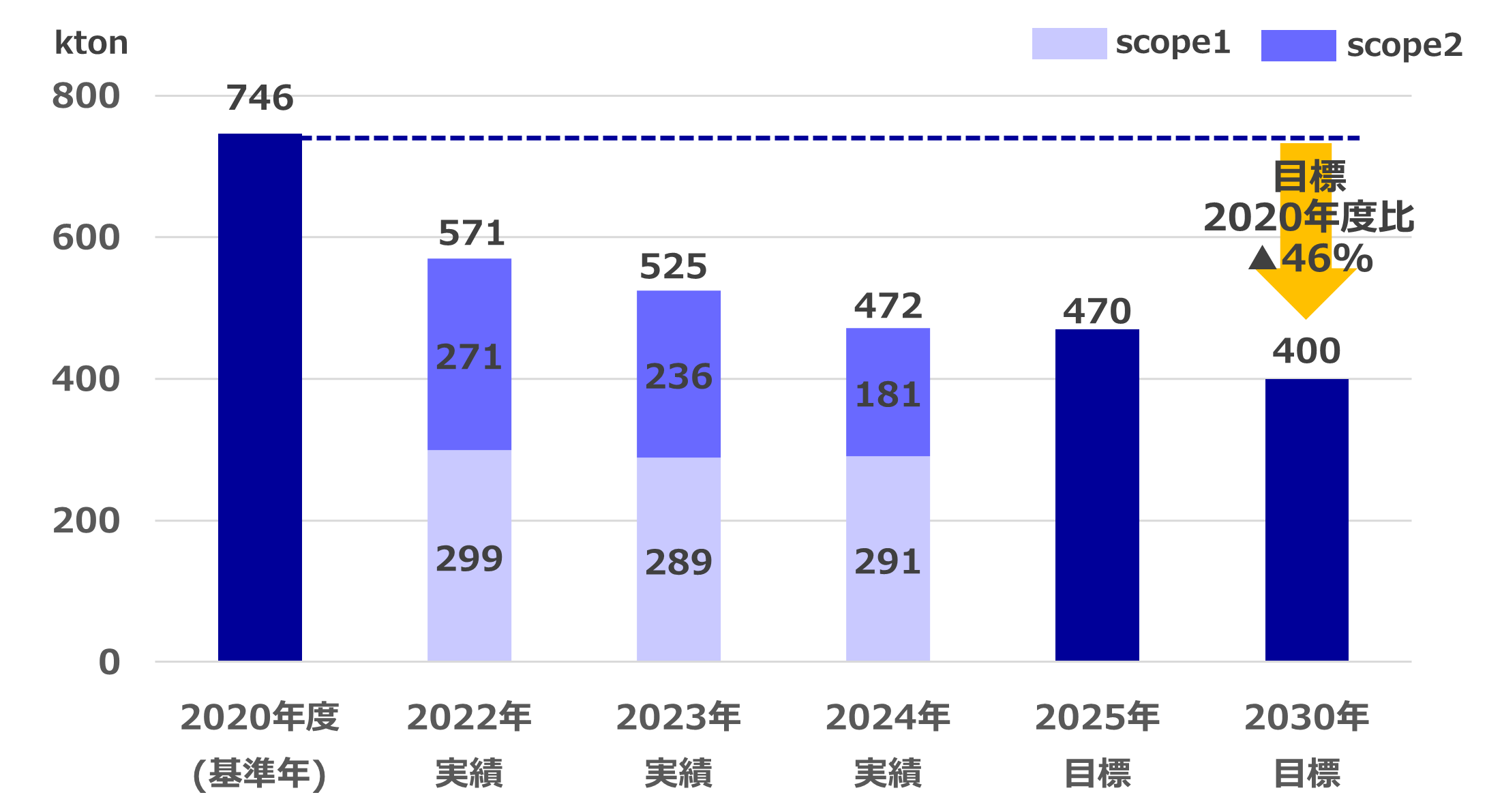 CO2排出量(Scope1+2) 746kton 571kton 525kton 472kton 470kton 400kton