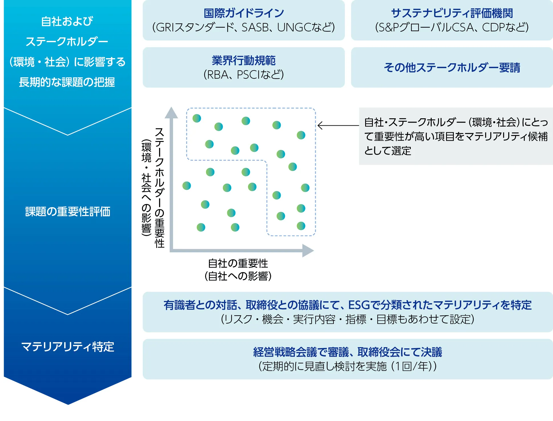 このマテリアリティは、自社およびステークホルダー(環境・社会)に影響する長期的な課題から重要性が高い項目を抽出・特定しています。取り組みにあたっては、それぞれの課題におけるリスクと機会を認識し、事業計画へ反映しています。