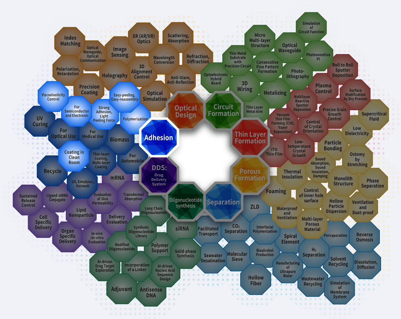 At Nitto Group, based on 8 core technologies, dozens of peripheral technologies have been researched and developed. These technologies have been combined to create a “composite of technologies”,