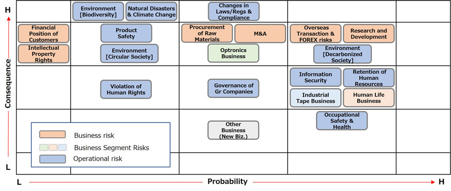 As a group, we manage risks and opportunities related to the environment issues including climate change comprehensively by integrating them with other major risks that significantly impact our business operations. We assess the relative importance of individual risks by analyzing them using a graph with two axes––a vertical axis representing the “degree of impact” on our business in case of occurrence or manifestation, and a horizontal axis representing the “probability of occurrence”––and recognize the significance of climate change risks among group-wide risks. We categorize these group-wide risks into “business risks,” which are associated with our businesses, and “operational risks,” which can generate group-wide impact, and implement appropriate risk management on a group basis. The major group-wide risks in fiscal 2024 are as follows. Please see here for more details.