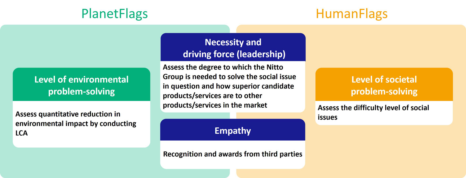 In fiscal year 2022, the Nitto Group established a recognition scheme for products and services that contribute to the environment and human society. By visualizing these contributions and recognizing those with particularly high impact as PlanetFlags™/HumanFlags™, we demonstrate our commitment to material issues for sustainability (materiality).