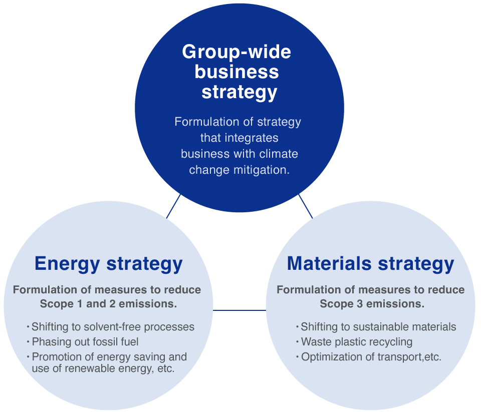 | An increase in GHG emission price | An increase in taxation costs (operating costs) due to the increased introduction of carbon taxes and carbon emission levies | Reduction of GHG emissions (Scope 1+2) through promoting use of renewable energy, shifting to solvent-free processes, and improving infrastructure and utility efficiency | CO2 emissions (Scope 1+2):400kton(2030)