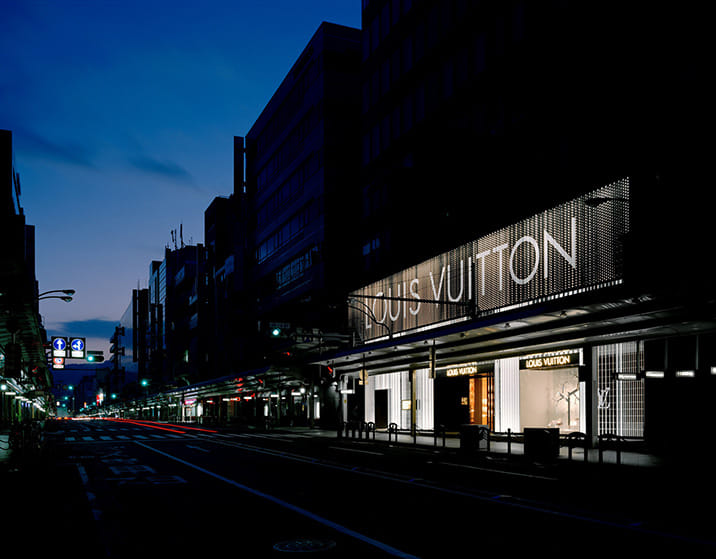 The former facade of Louis Vuitton Kyoto Daimaru on Shijo-dori street featured polarizing plates that created a black lattice pattern with neither thickness nor texture. The plates’ characteristics produce a pattern that appears to rotate, change, and disappear as the viewer walks past. When they stop, the pattern stops moving as well. © Daici Ano