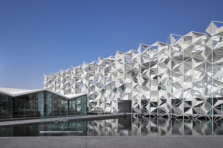 The facade design for the Dubai Expo 2020 Japan Pavilion features a three-dimensional lattice that combines Arabesque and Asanoha patterns. Small membrane panels block the sun, casting beautiful shadows on the water's surface and visualizing the wind. The water naturally cools the air as it flows into the building, and by incorporating systems with a history of use in Japan and the Middle East, the architecture provides a link between their respective cultures and technologies. © Dubai Expo 2020 Japan Pavilion