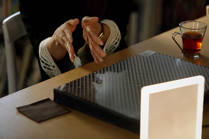 Referencing the vertical latticework of Kyoto townhouses and a pattern on an old Louis Vuitton trunk, she used polarizing plates to create an eye-catching vertical lattice with no discernible thickness. This was followed by works with architectural dynamism and intelligent details, weaving together unique ideas and beautiful expressions in a fascinating manner. Picking up a RAYCREA prototype, she began sharing some interesting ideas for signage.